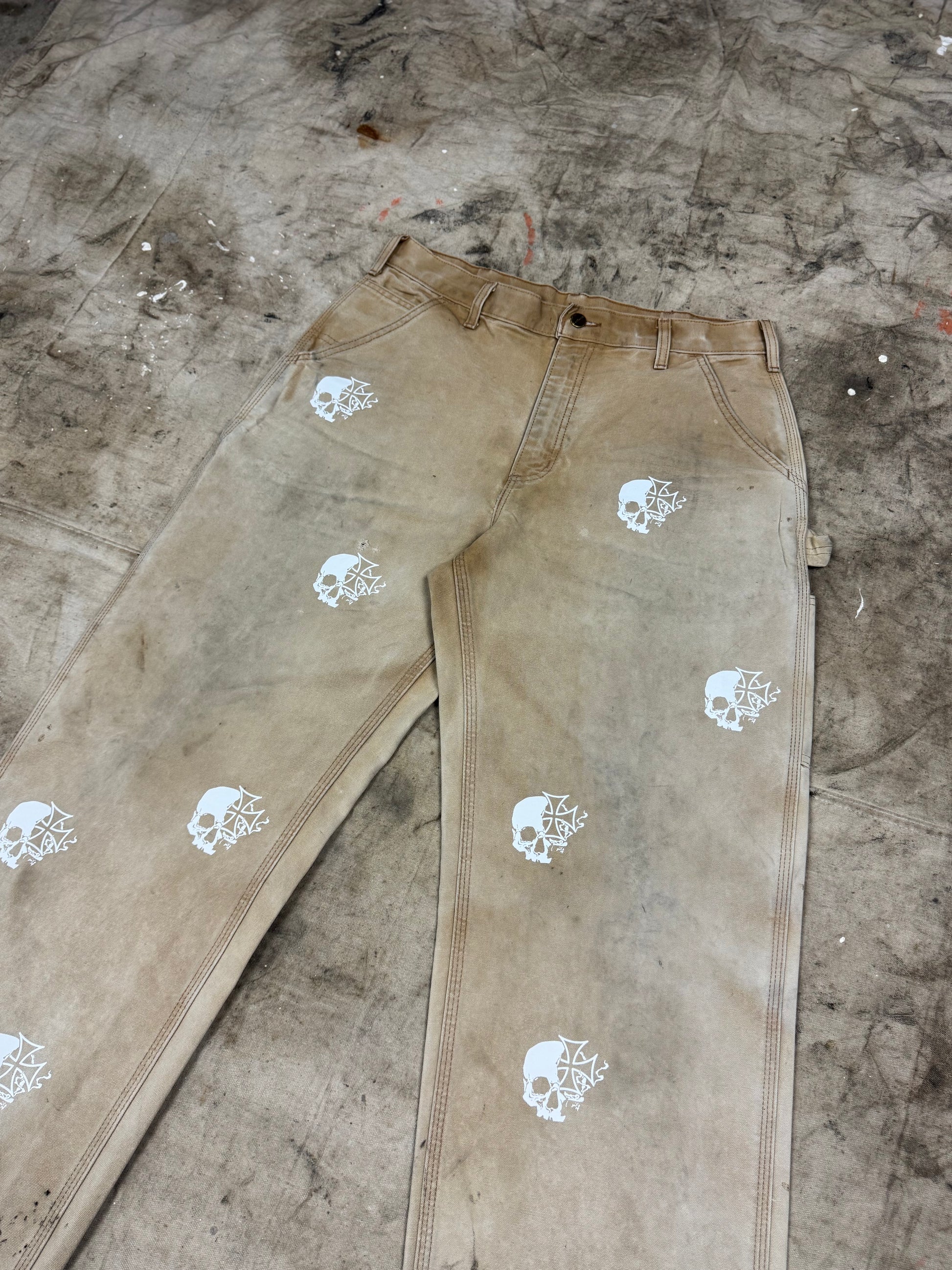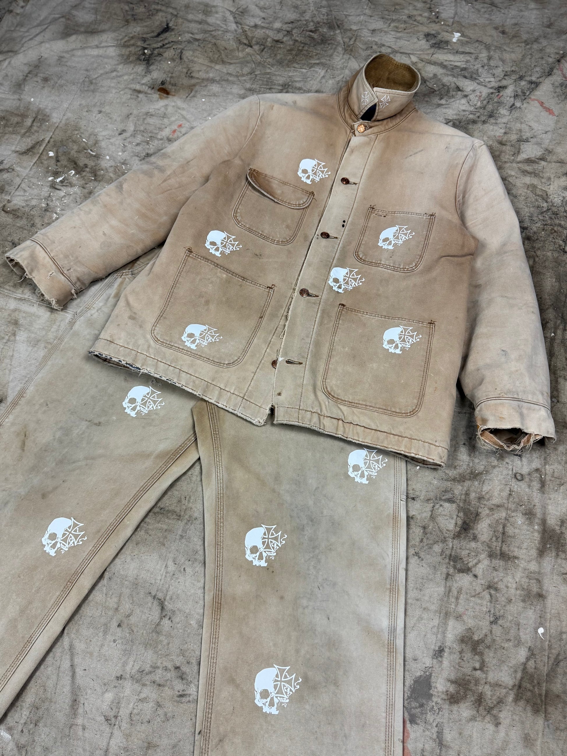 STORMRIDERS Workwear Suit. This set includes vintage Wrangler Blue Bell canvas work jacket and original vintage Carhartt B11 work pant. Set has Stormriders all over print with the Skull & Cross.
