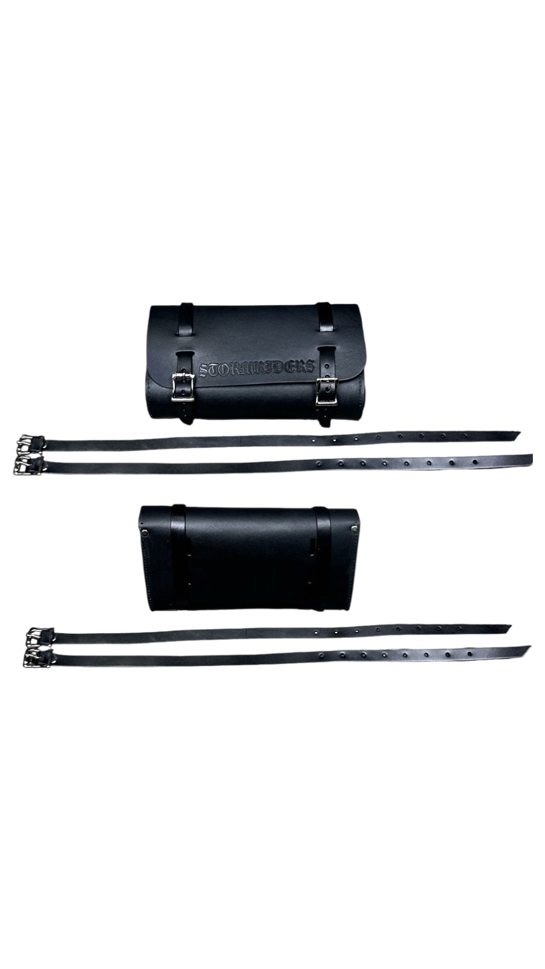Stormriders black leather bag. Mounts to your handlebars, frame, or wherever else you want on your bike.